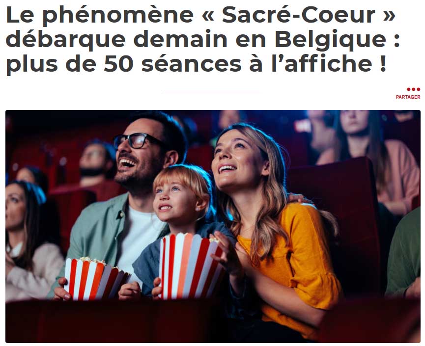 Hello tous, je ne sais pas si vous avez vu, mais le film SACRE-COEUR sera diffuser plus de 50 fois dans les cinémas belges francophones ! C’est truc de fou.